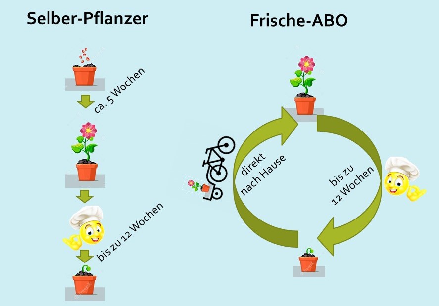 Du kaufst dir Samen deiner Wahl und pflanzt diese in unsere Pflanztöpfe. Nun brauchst du Geduld. Es dauert ca. 5 Wochen, bis du eine erste Ernte einfährst. Aber dann kannst du bis zu 12 Wochen schmackhafte und knack-frische Kräuter geniessen.